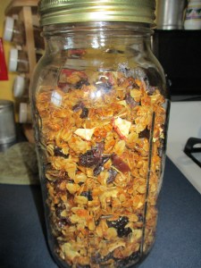 On Sunday I made more yummy granola. Each time I make it, I add more to it: So far I have added sunflower seeds, dates, raisins, dried cherries, and our own dried apples. It is so yummy that it doesn’t last long and I have to make a batch several times a week. I also spent an hour or two cutting up more apples to put in our dehydrator.