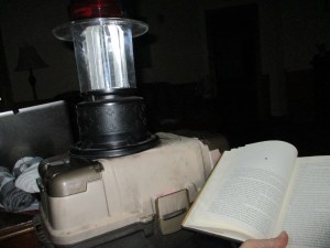 After several hours, the power came back on. It stayed on long enough for me to reset all the clocks–on the alarm clock in the bedroom, on the stove, on the microwave, and on the coffee machine–and then it went out again. I was in the dark again. It went off rather spectacularly: Flickering on and off repeatedly. Down the driveway, near the road, I saw huge green and orange explosive flashes that lit up the sky, looking like a forest fire…or an alien attack. I texted a description of the flashes to EJ at work. He texted back that it sounded like an arc flash, which is an electrical explosion. I really hope none of the electrical workers were injured by it.