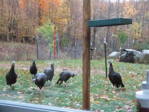 Then I identified it. I laughed in relief. Ha, ha. The rustling noises had been turkeys flying up one-by-one to roost in the trees for the night. I had seen them a short time before wandering past our windows on their way to the back yard.