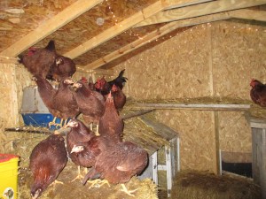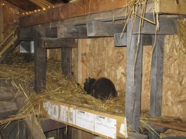 If the cats aren’t already in the coop, I just yell, “Here, Kitty, Kitty!” and they come running. During the summer Annie preferred to sleep out in one of the dog houses we have in the garden for shelter. However, when the weather turned colder, I put her in the coop despite her protests because it’s warmer and safer in the coop. After a few days, she quit complaining and now she spends a lot of her time in the coop, sleeping on a bed of straw.