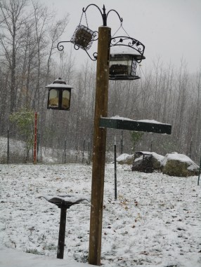 Earlier in the week, I set up all the bird feeders on the post. We also moved the birdbath closer to the feeders. In the summer it’s a birdbath; in the winter it becomes a birdfeeder–or, rather, a deer feeder. I don’t deliberately try to feed the deer, but I can’t keep them from the feeders so I give in to the inevitable. We’ve been enjoying the feasting birds. I miss Miss Madeline Meadows, our serial killer cat, but I’m relieved I won’t find a bunch of bodies this year. Annie, Theo, and Millie aren’t even close to being the hunters she was. Madeline was epic.
