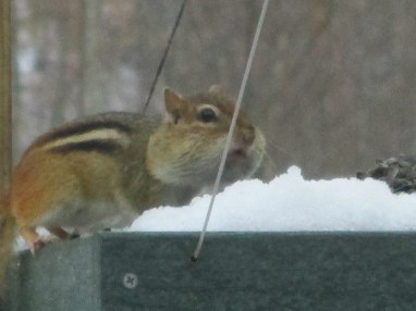 In addition to birds, we’ve had other critters feasting at the feeders. Chipmunks are frequent visitors. They stuff their cheeks with seeds until they are bulging. It’s rather comical to see.