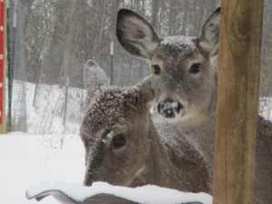 Sometimes the deer see us moving in the house and they look straight at us. If we don’t spook them too much they go back to eating. Sometimes one deer will chase off another, and sometimes they will even fight a bit. Today, after eating corn from the birdbath, a deer ate from one of the birdfeeders hanging from the post. Fortunately, this is the only one they can reach–otherwise, they would drain them all and leave nothing for the birds. I took a video of the deer. Hannah Joy was sleeping on my lap and didn’t even see them.