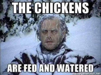 Today was cold. It was only 20(f) degrees, which really isn’t horribly cold, but it felt very cold–probably because it was also windy. The chickens and cats stayed in their coop today. They aren’t stupid. As soon as EJ left for work, I went out to feed and water them 0(as I usually do) and, since they were all staying inside, I shut their little door rather than wait for evening. Although I put them early to bed, I still went out later to make sure they were ok and to refill the cats’ food dish. The chickens eat the cats’ food so I refill their bowl every now and then throughout the day.