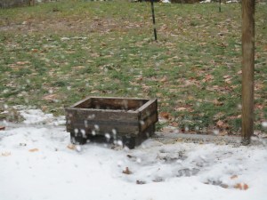 I think it was Edison’s Mama who broke the birdbath feeder. She was on her hind legs eating from the lantern birdfeeder. When she came down, she caught the edge of the “bowl” and broke it. This morning I got a wooden box from our raised garden and set it on the deck with corn in it. We put a little corn out in hopes the deer will ignore our hanging birdfeeders, which they kind of sometimes do. A deer came up to the box but the unfamiliarity spooked her. A chipmunk has been enjoying the corn most of the day, stuffing his cheeks full.