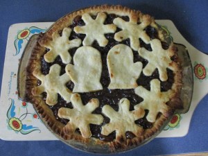I sorted through my more than 30 cookie cutters to find one to decorate the mincemeat pie. I decided to decorate the pie with snowflakes and mittens in honor of the snowy day. At first, I couldn’t find the mitten cookie cutter and I cried, “I’ve lost my mitten! Now I shall have no pie!” But then I found it so I got pie after all. I thought the mincemeat pie looked awesome. It tasted awesome too.