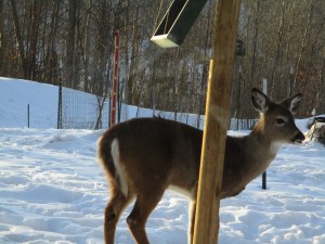 After the deer all left, a squirrel ran up to check the feeder. A blue jay also checked it out. They were unimpressed. There was nothing there because the deer ate it all. I might put a little more seed out for them so the birds can have something rather than nothing. I am still trying to re-think how to construct my feeders so the deer can’t access it all.