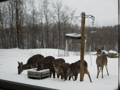 I hadn’t stopped filling the bird feeders a week or so ago because the warmer weather was waking up the bears. Someone who lived only a couple miles from us had posted on FB that there had been a bear in her driveway. Hungry bears like eating from birdfeeders. However, because of the snow, I decided to put feed out for the birds today. It wasn’t long before the deer came trotting in. We had seven deer eating the seed! They didn’t leave any for bears.