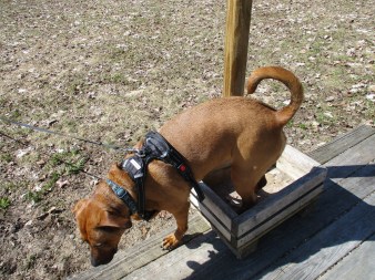 I fastened Hannah Joy’s leash to a T-post so she could be outside with us while we worked. I moved one of the smaller garden boxes near the birdfeeder post, hoping that it will keep Hannah from wrapping her leash around it. Silly dog, she tried to sit in the box. She must think she’s a cat.