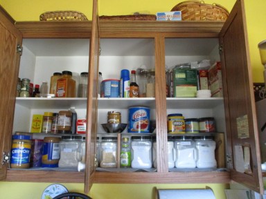 EJ enjoys almonds. He often takes them to work for a healthy snack. The almonds come in square containers which are the perfect size to hold sugar, baking powder, baking soda, bread crumbs–anything dry. So when EJ empties a container, I take it to repurpose it. Even with the wonderful almond containers, the cupboard is crowded and we have to keep moving things out of the way to get to the item we want. There is a lot of wasted space because most of the containers are not tall. I mentioned to EJ this morning that I could organize the cupboard better if I had an additional shelf inside the cupboard. He went out to the garage and built one, making a 2-shelf cupboard into a 3-shelf one. Then together we happily organized everything.