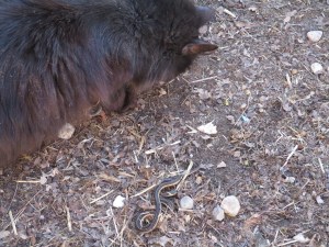 One afternoon last weekend when I went out to gather eggs, I saw Millie come trotting into the garden. Something about her looked strange, so I looked closer. She was carrying a snake! I hurried into the house to tell EJ. He came outside to look at it. He said it was just a harmless snake, and he tried to rescue it, but Millie killed it before he could. I wouldn’t have minded EJ letting it go into the woods, but I’m glad Millie didn’t carry it into the coop and release it. I wouldn’t want a snake eating our eggs.