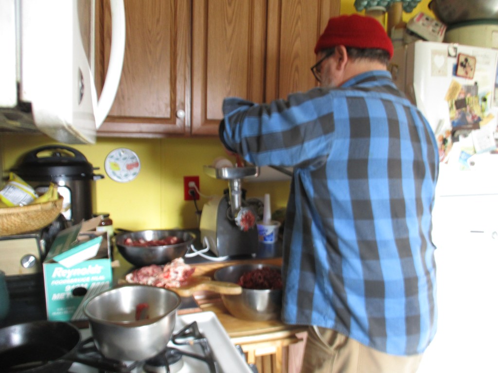 Yesterday EJ did a little last-minute shopping. We were hoping to get another turkey to put in our freezer for a later time–turkeys are always on sale at this time of year. But we waited too long and they were all gone. Oh, well. EJ brought home two deer from his hunting trip so our freezer will be filled. EJ has done his own butchering. He saved some meat for venison steaks and has been turning the rest into burger. Buying a meat grinder a few years ago was a good investment. EJ ran the venison through the grinder once so far, but he will do it again several times to get it finer. He said he would like to try to make venison sausage this year. He will buy supplies after Thanksgiving.