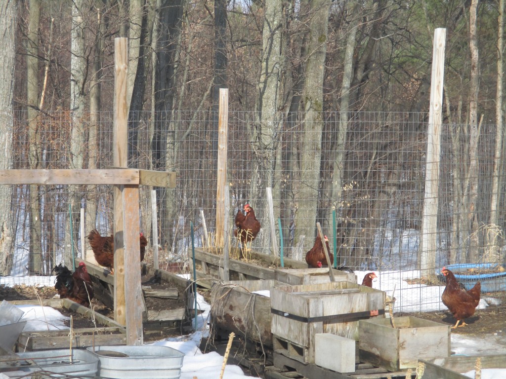 The chickens don’t come out of their coop when the weather is cold and snowy. However, the weather has been so nice lately that they’ve been getting out to enjoy it. Between planting and harvest, we keep the chickens out of the garden but the rest of the year they are free to enjoy it. Their scratching and pooping help improve the soil.