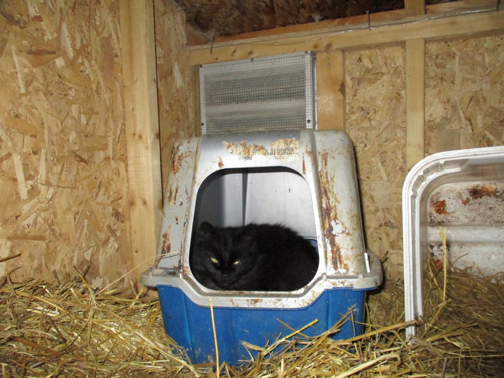 Yesterday morning as I was in the coop scooping out feed for the chickens, I heard low menacing growls. I thought, “Oh, crap!” as I envisioned a vicious critter of some sort lurking in the shadows. But I saw no murdered chickens, which I’m pretty sure I would have found if a predator had gotten into the coop. Then I became aware that along with the growls, I heard irritated clucking. I looked around and quickly realized what was going on: The hens’ favorite nesting box is a covered litter box that I filled with straw and put in the coop for them. It’s also Millie’s favorite place to sleep at night. A hen was irritated because couldn’t go into the box to lay her egg because Millie was still in it. Millie was annoyed because she couldn’t get out of the box because the irritated hen was in front of it. Now and then the hen pecked at Millie and Millie swatted at her. When I approached them to arbitrate the conflict, Millie fluidly leaped out and went on her way into the garden and the satisfied hen entered the box to lay her egg. Conflict resolved. LOL.