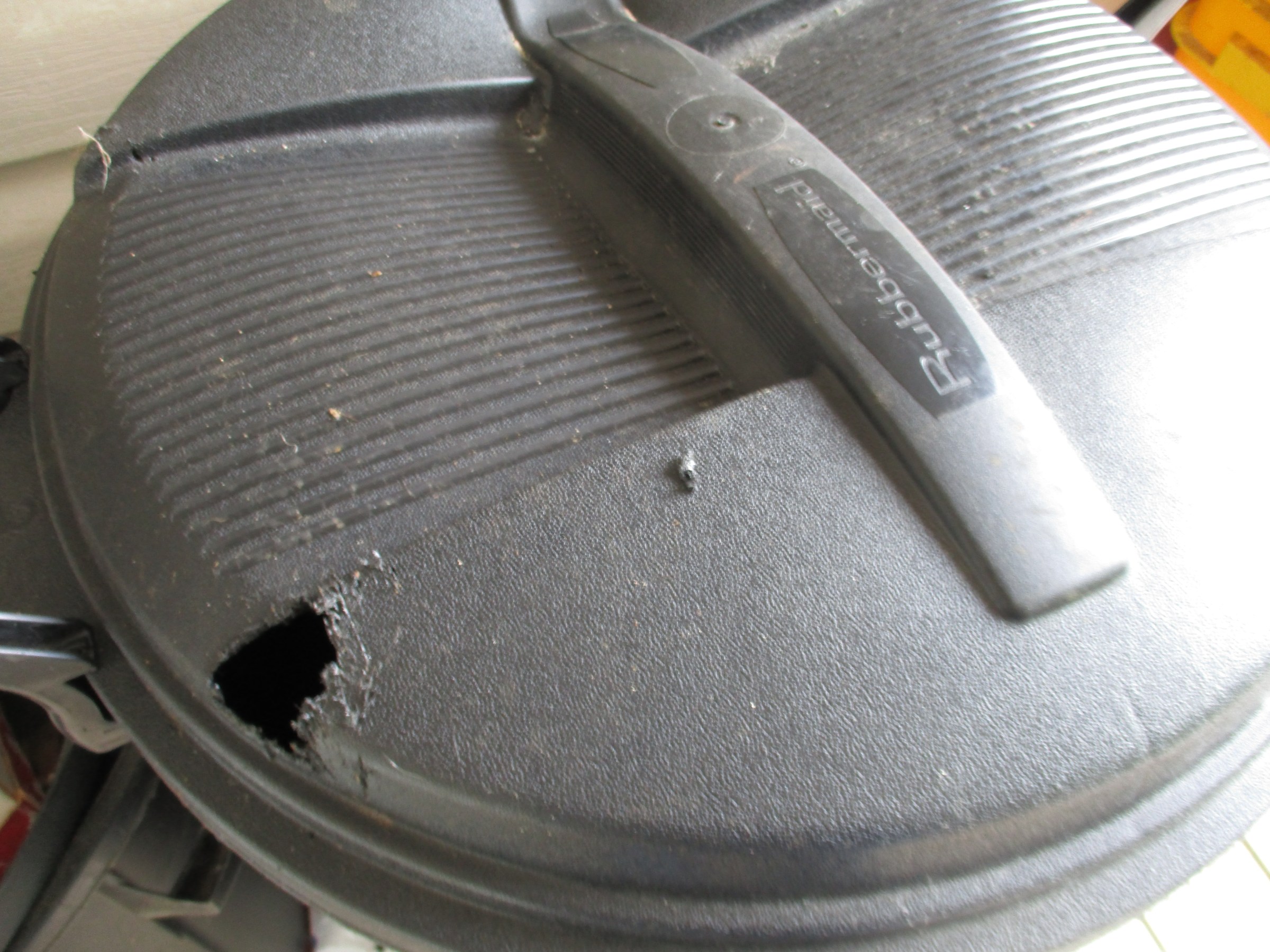 We have always kept the wildbird seed in a large plastic trash can with a locking lid. We kept it in the pantry, but every summer we have a problem with little moths. When I saw a couple of them fly out of the seed trash can, I thought, “Ah ha! That’s the food source for the moths!” Either the moths are getting into the cans when I open it to get seed out for the birds or the larvae are coming in the sacks from the store. So I put the seed trash can out on the front porch a couple of weeks ago. With the locking lid, I figured it would be safe from critters. Apparently not.
