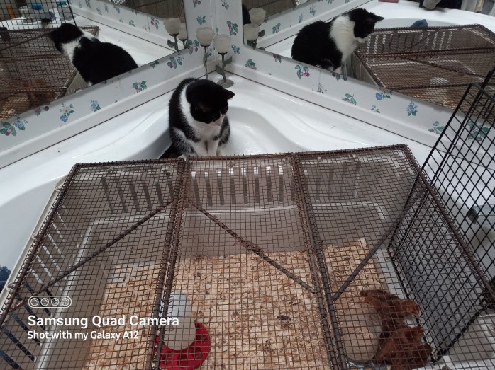 I wasn’t really sure how Hannah Joy, Timmy, and Little Bear would react to the chicks. The animals are curious, but mostly ignore them. Once I saw that they were all ok with them, I started leaving both the master bedroom and bathroom doors open. The only possible problem is that Hannah Joy seems to be protective of the chicks. She chases the cats away if they get too close so I always shut the doors if I am not going to be nearby. I don’t want any kerfuffle that dislodges the mesh over the chicks’ cage.
