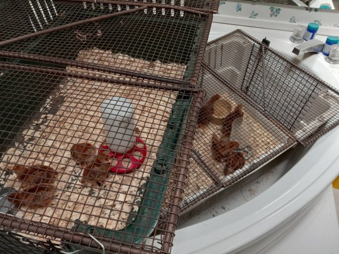 If we had been able to buy the four additional chicks sooner, we would have put them in with the other four, but the first four have grown so quickly, and are so much bigger, that we were afraid they would bully the little ones so we set up a second cage in the bathroom. The older chicks have probably quadrupled in size in a week, growing from a ball of downy fluff that we could hold in one hand to at least about the size of Robins with most of their feathers. EJ had used the bottom half of a dog crate for the original chicks. I used the top half of the dog crate–flipped over–for the second group of chicks. I placed the crate on top of the other crate, but kitty-wampus so I can access both cages to give them food and water. EJ has placed gratings on both crates to keep the chicks safe.