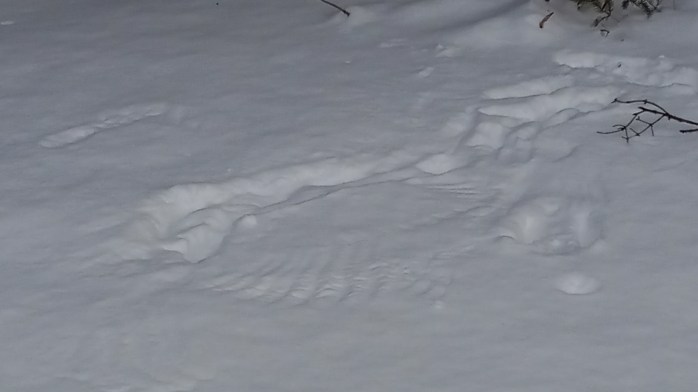 There are several things I really like about winter. I like the stark beauty. I like that it’s quieter than in the summer because neighbors are either inside or in Florida. I like watching the wildlife in our yard. I actually like watching the wildlife in every season. I also like to observe animal tracks. I see tracks in warmer months in the mud after rain showers but in winter I see many more tracks in the snow. I can see lots of deer tracks crisscrossing through our yard and into the forest. Sometimes I see turkey tracks. Or little rodent tracks with a line where their tails have dragged. And every now and then, I see even more interesting tracks.