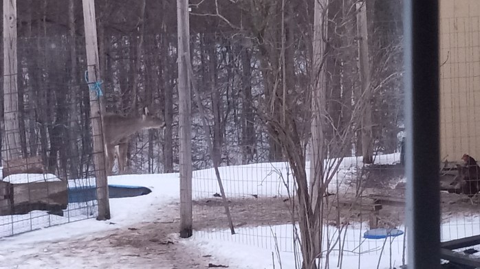 A week or two ago, I looked out the bedroom window near sunset to see if the chickens had all gone to roost in the coop for the night. I saw a few still outside heading toward the coop. I also saw a few deer on the other side of the garden fence. One was very curious about the chickens. She went right up to the fence and was watching them.