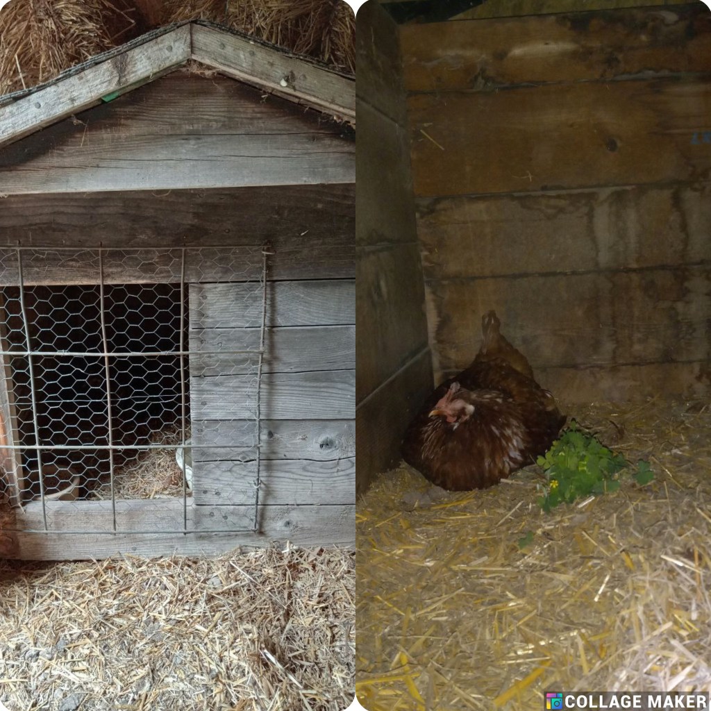 Once I had the dog house door completed, I put White Feather in it with food, water, and treats of grass that I pull up for her every day. Ideally, Mean Girl should have been the one shut away, but I don’t think White Feather minds being in a protected place. She seemed so terrorized that I wasn’t sure she was going to make it but I check every day and she’s still alive. She’s sitting up although she still seems unusually docile. I hope she makes it.
