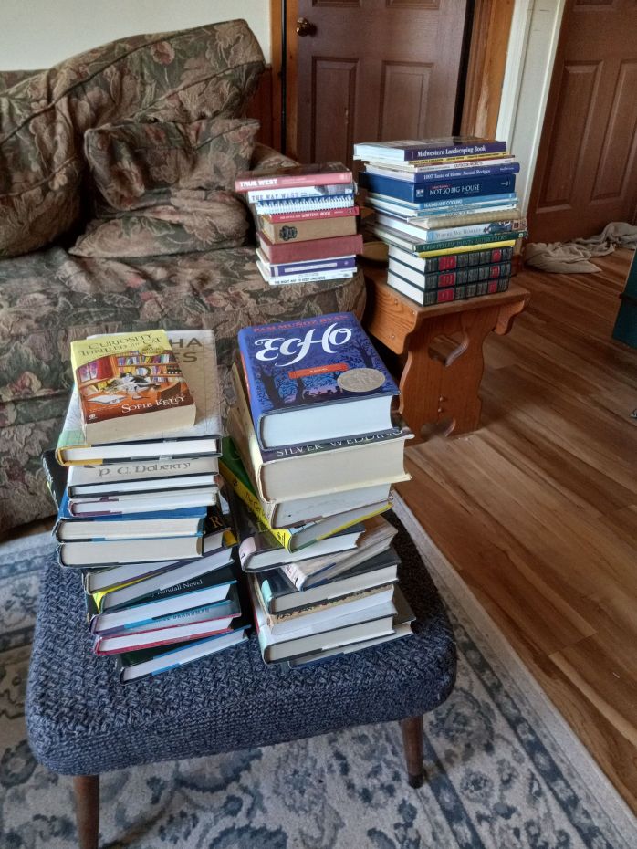 Saturday we attended our local library’s used book sale. We were excited because 1. We LOVE library used book sales and 2. The sales are always held on Fridays and Saturdays and until a few months ago EJ’s schedule was Friday-Monday so we couldn’t attend them. But now his schedule is Tuesday-Friday so–Yay!–now we can enjoy them again even if we can only go on the second day of the sales. I was concerned that people would take all the books on Friday and there would be few left for us, but we still came home with multiple bags of books. After book sales I always feel like a dragon with a hoard of books instead of gold.