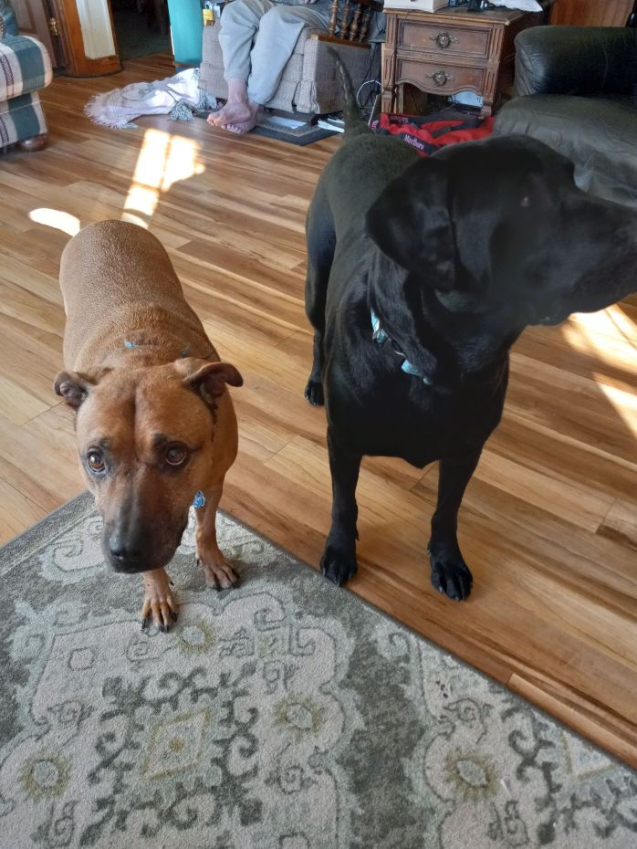 TH lives far enough away (about 2 hours) that when he has an appointment in our area, he often spends the night with us and goes to his appointments the next day. That way he has a more relaxed schedule. TH had an appointment this last Tuesday so he arrived on Monday afternoon…with Cletus. He couldn’t exactly leave his new dog home alone. This was the first time we met Cousin Cletus. I was concerned about how Hannah would react to a strange dog. I gave it some thought and messaged TH that when they arrived, I would put Hannah out on her tether and he could bring Cletus near but pull him back if she was hostile. He thought that was a good idea because it was more neutral than the two dogs meeting in HANNAH’s house. EJ said that when Hannah saw huge Cousin Cletus coming toward her, her eyes got very big. Once we saw that there wouldn’t be outright hostility, we brought the dogs into the house.