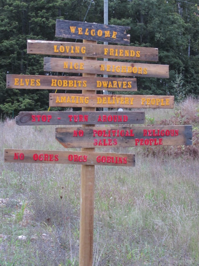You may have noticed that one board says “No Political, Religious, Sales People.” That’s because in the two years that we’ve lived in Northern Michigan, we’ve had at least a dozen visits by Jehovah Witnesses. They don’t visit during the snowy months–no one wants to venture up our steep driveway in the winter–so we get frequent visits in the summer. I’m not a JW and I’m not going to change my whole belief system or church because a random stranger knocks at the door. We are rather isolated so I don’t like unexpected strangers. I was going to put “No uninvited strangers” on a board, but I ran out of the necessary letters.