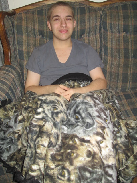 We were told that JJ will be sitting in a recliner during chemo, and that there is a TV in the room, and that JJ can bring snacks and items from home. I have been adding to our “chemo bag,” filling it with things to occupy us all for the seven hours we will be at the hospital tomorrow. I packed books, and DVDs, and snacks. I packed JJ’s Prayer Blanket that the local church gave him, and also his Bear Hat. Once I know more of what to expect, I hope I can bring my laptop with me. I don’t want to bring it if I can’t use it. EJ is hoping we have comfy chairs to sit in so he can finally sleep.